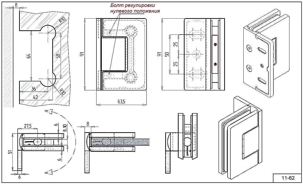 Петля 11-62 с РНП для стекла 8-10 мм. стена-стекло