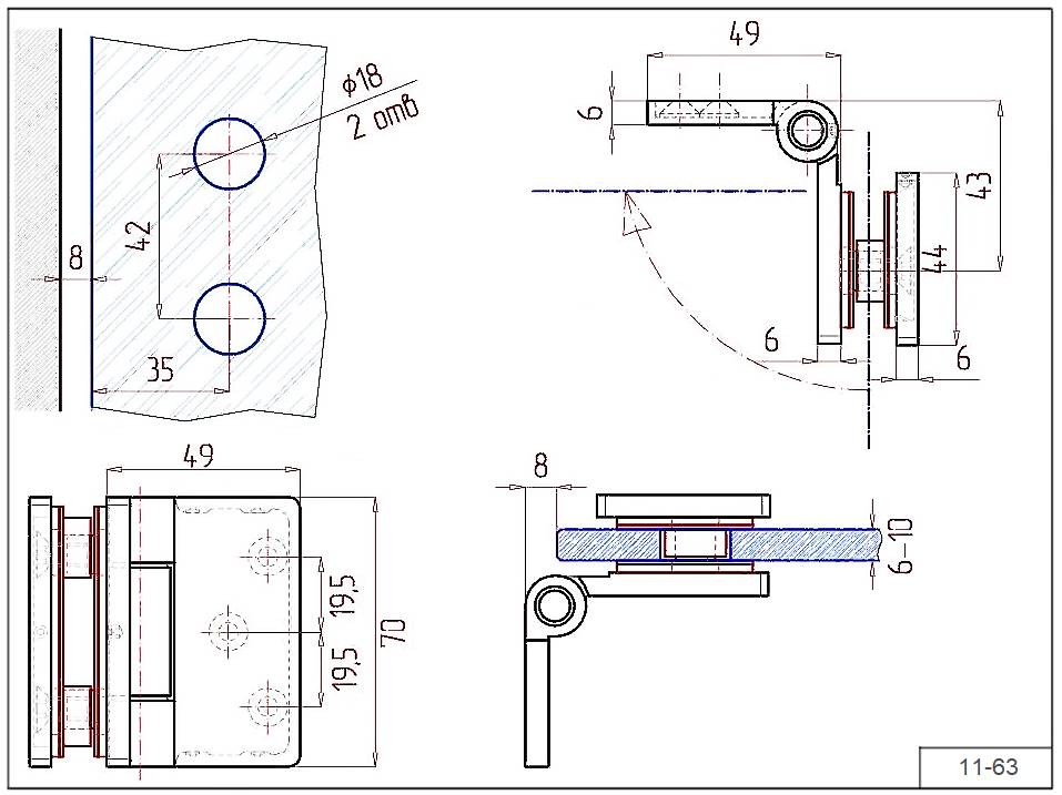 Петля 11-63 для стекла 6-10 мм. стена-стекло без фиксации