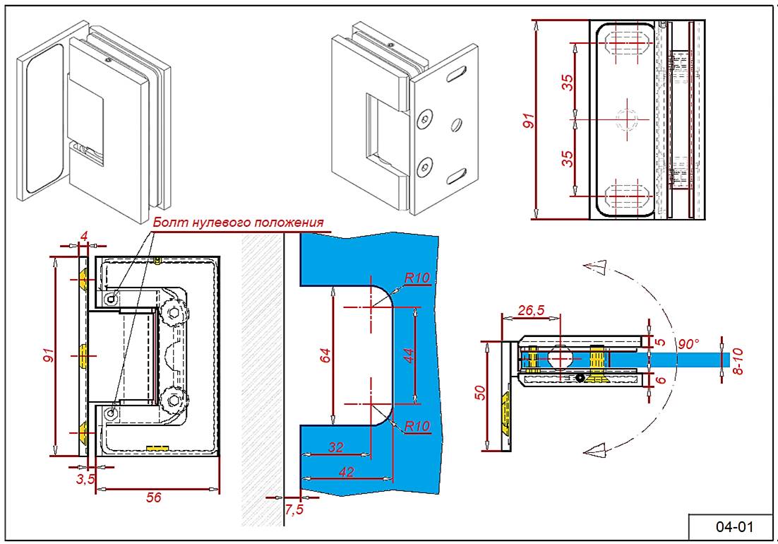 Петля 04-01 с РНП для стекла 8-10 мм. стена-стекло 90°гр.