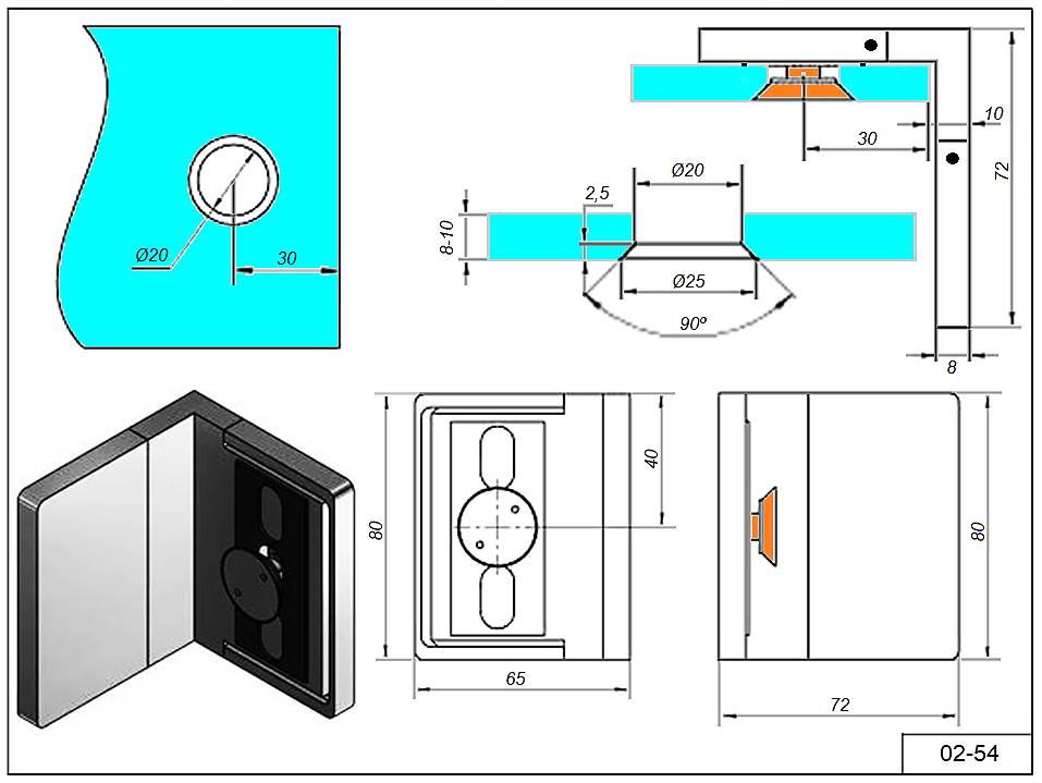 Коннектор 02-54 ЛЕВЫЙ стена-стекло 8-10 мм. Под зенковку 90°гр.