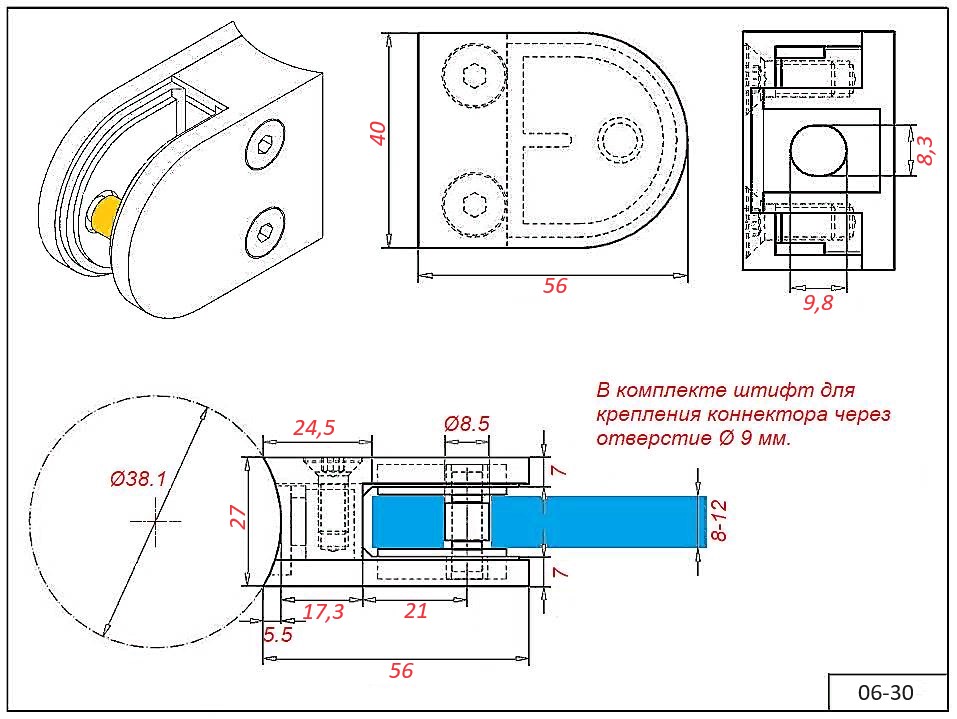 Коннектор 06-30 литой со штифтом на трубу Ø38.1 для стекла 8-12 мм.