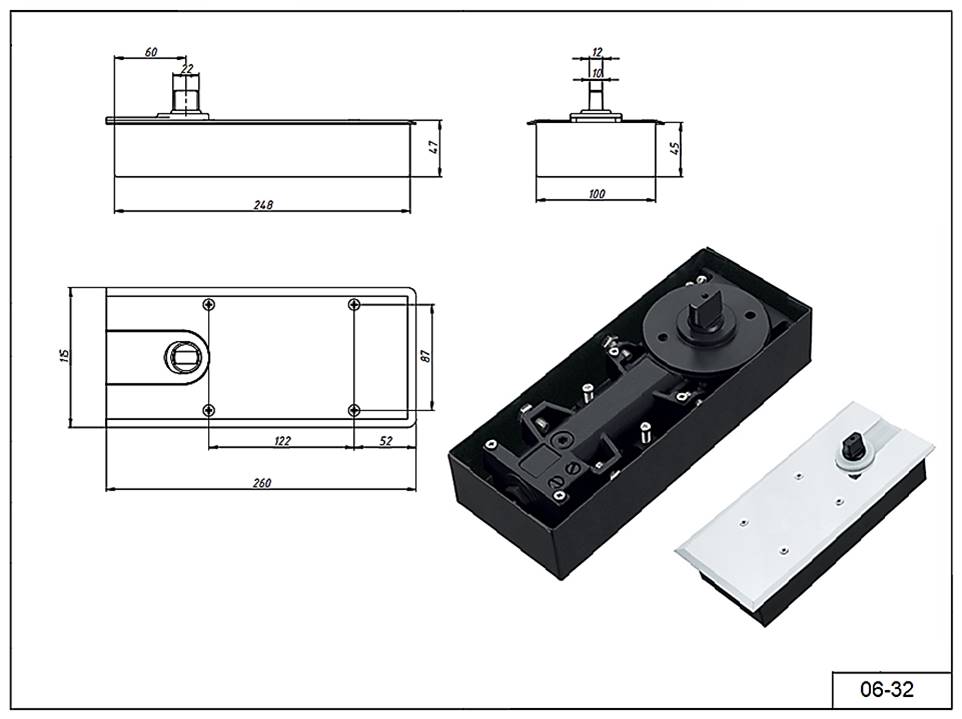 Комплект предназначен для установки на стандартный напольный доводчик двери из дерева, алюминия битона и пр.