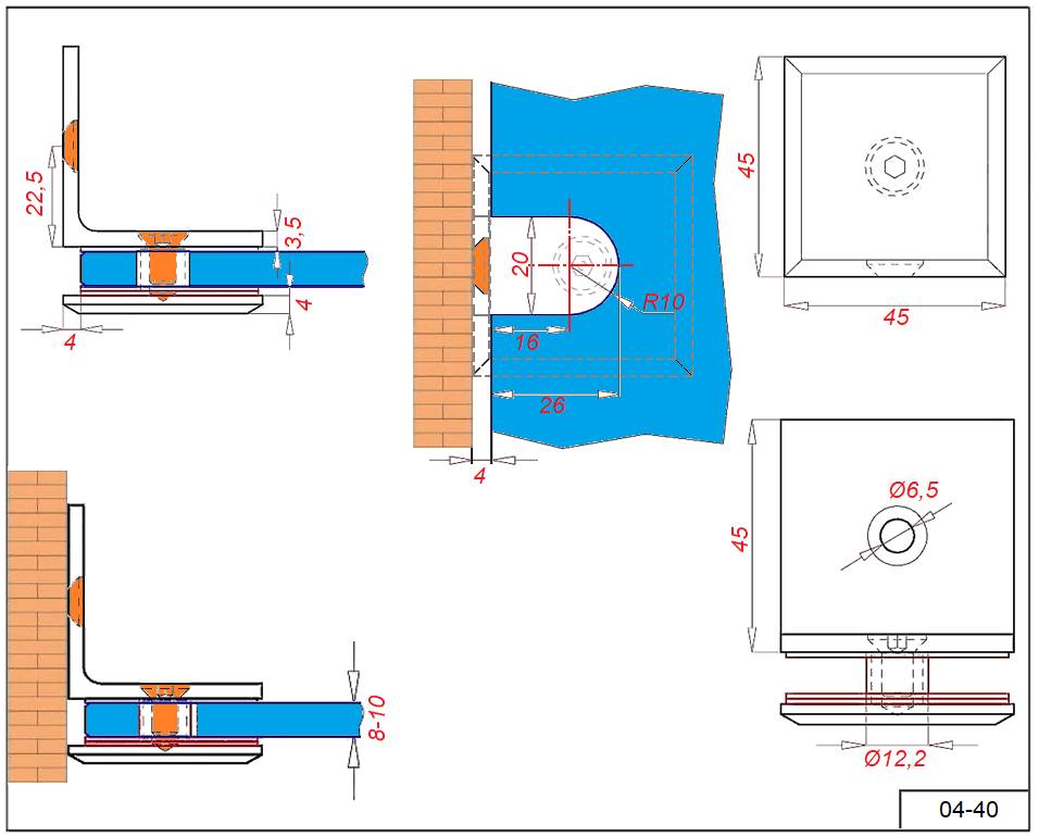 Коннектор 04-40 стена-стекло 8-10 мм. Угол крепления 90°гр.