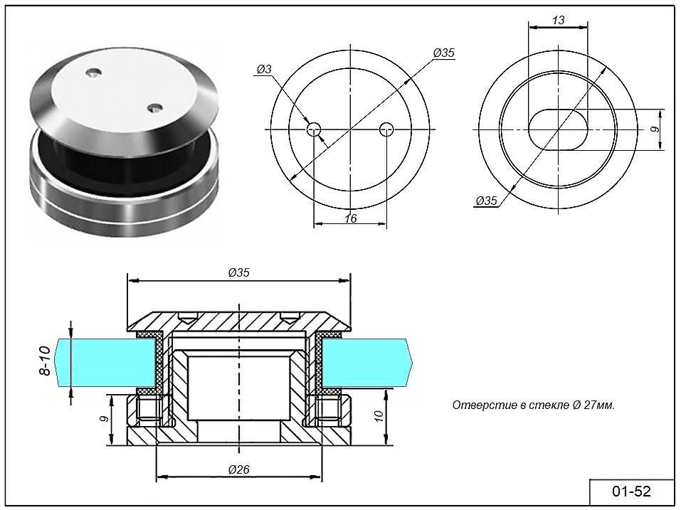 Крепеж 01-52 без зенковки стекло 8-10 мм. Регулируемое 10,5-12,5 мм.