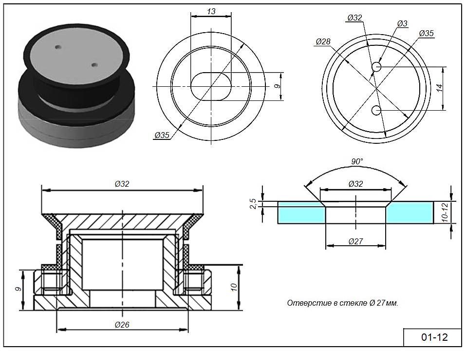 Крепеж 01-12 под зенковку стекло 10-12 мм. Регулируемое 10,5-12,5 мм.