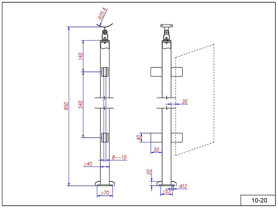 Стойка 10-20 квадрат 40*40 для стекла 8-10 мм. под поручень Ø 50 мм.
