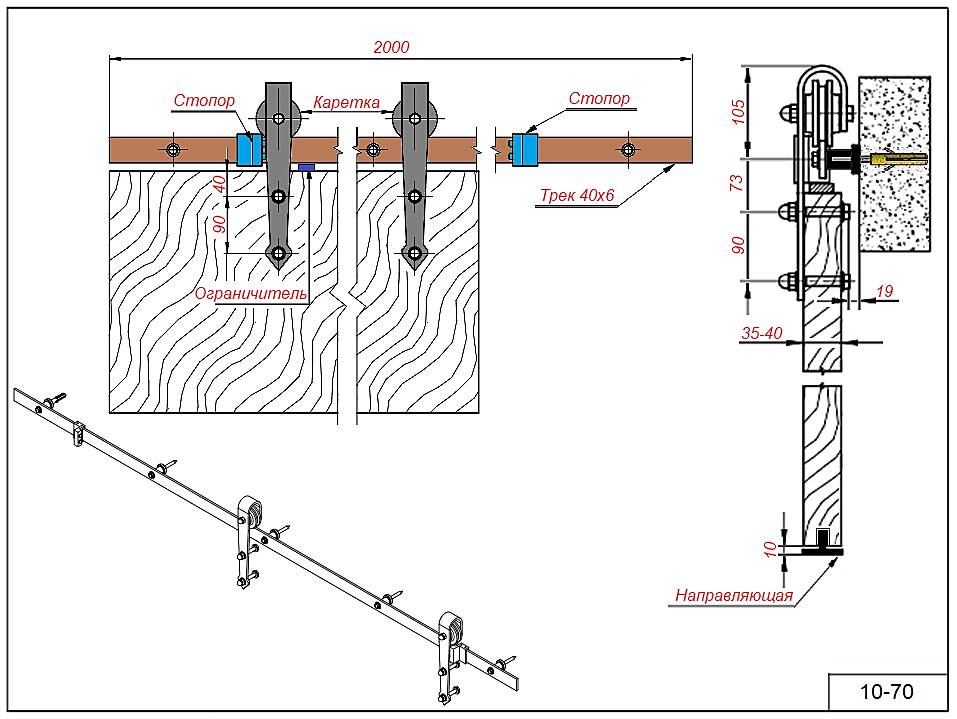 Трек 2000 мм, Крепление трека к стене- 5 шт., Каретки - 2 шт., Стопор-2шт., Ограничитель- 2 шт., Направляющая - 1 шт., Все элементы окрашены, порошковой краской в матовый черный цвет