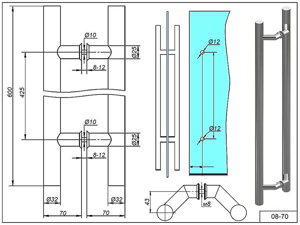 Ручка 08-70 для стекла 8-12 мм. 45°гр. 32*425*600 AISI 304