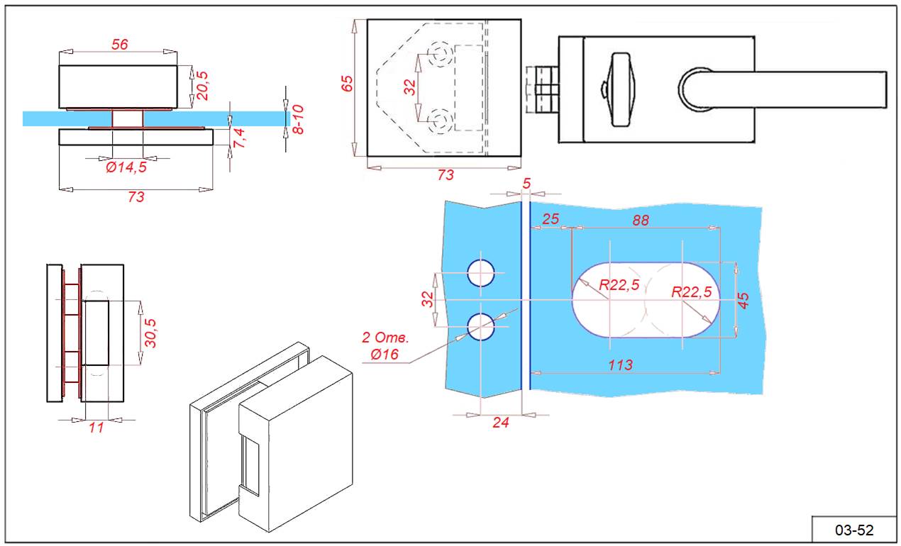 Ответная часть 03-52 для замков 10-62, 05-93, 05-94-304, 05-95, 05-96-304 на стекло 8-10 мм.